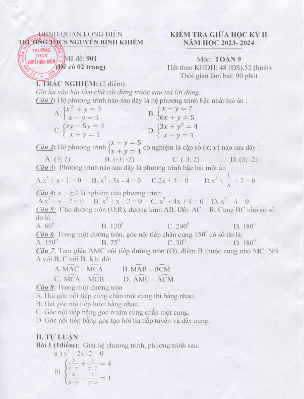 Đề Thi Giữa HK2 Toán 9 Đề giữa học kỳ 2 Toán 9 năm 2023 – 2024 trường THCS Nguyễn Bỉnh Khiêm – Hà Nội 22/03/2024