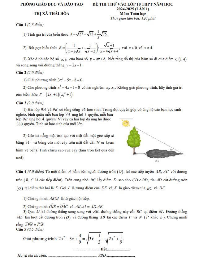 Đề Thi Tuyển Sinh Lớp 10 Môn Toán Đề thi thử Toán vào lớp 10 lần 1 năm 2024 – 2025 phòng GD&ĐT Thái Hòa – Nghệ An 24/03/2024