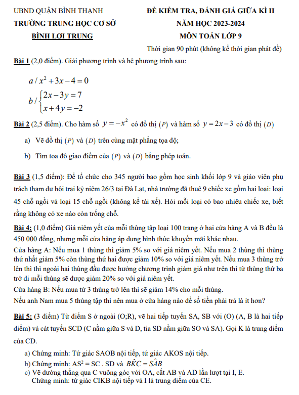 Đề Thi Giữa HK2 Toán 9 Bộ đề tham khảo giữa kì 2 Toán 9 năm 2023 – 2024 phòng GD&ĐT Bình Thạnh – TP HCM 19/03/2024
