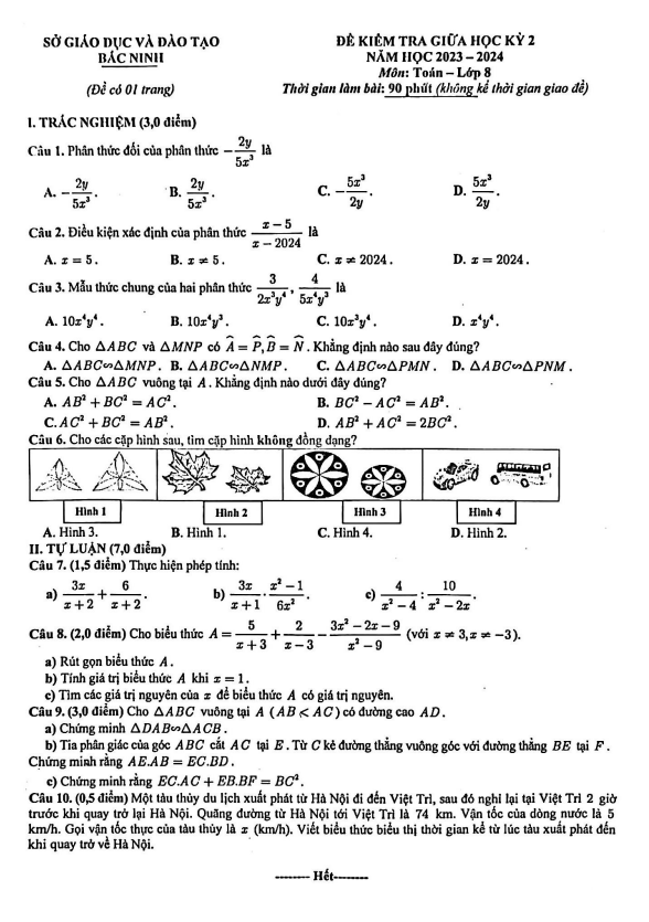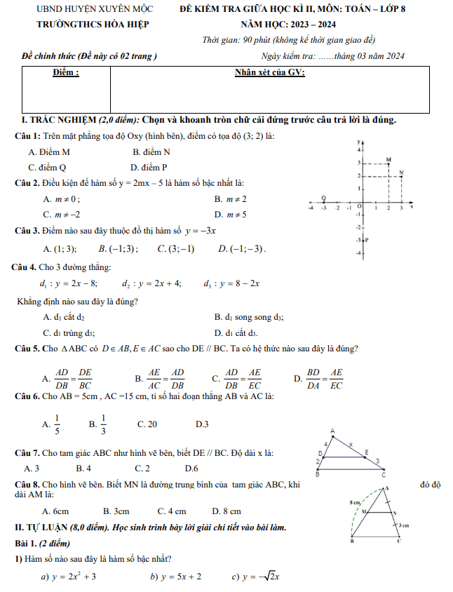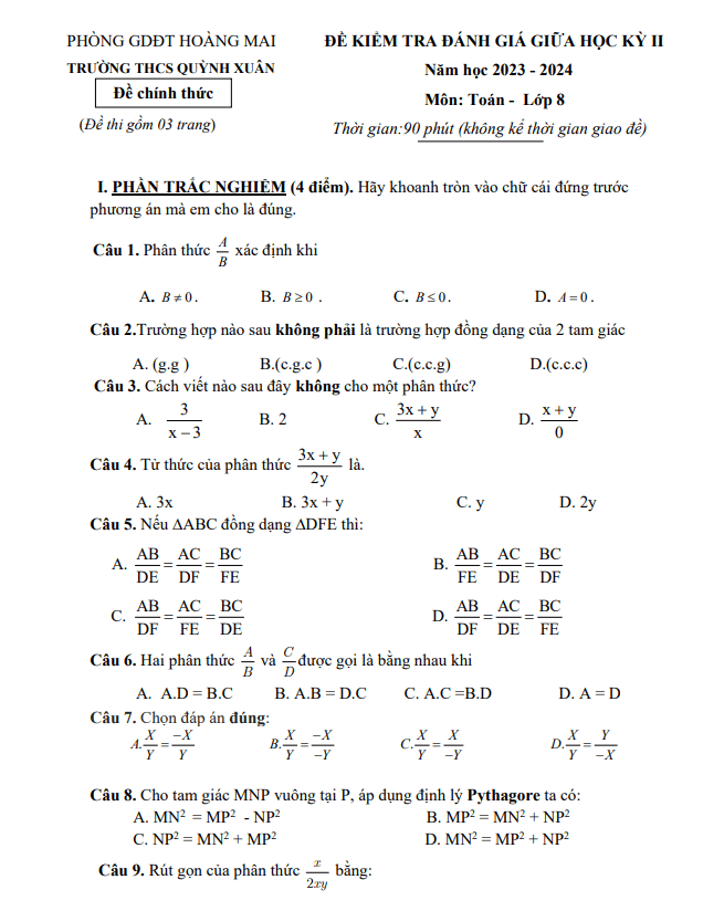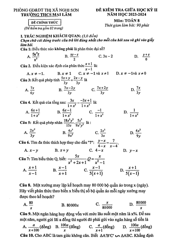 Đề Thi Giữa HK2 Toán 8 Đề giữa học kỳ 2 Toán 8 năm 2023 – 2024 trường THCS Mai Lâm – Thanh Hóa 20/03/2024