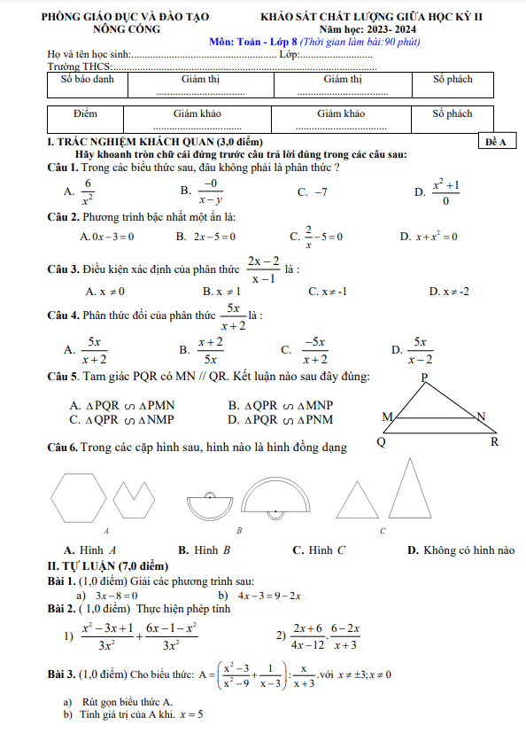 Đề Thi Giữa HK2 Toán 8 Đề giữa học kỳ 2 Toán 8 năm 2023 – 2024 phòng GD&ĐT Nông Cống – Thanh Hóa 19/03/2024
