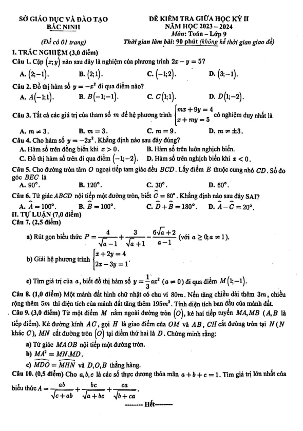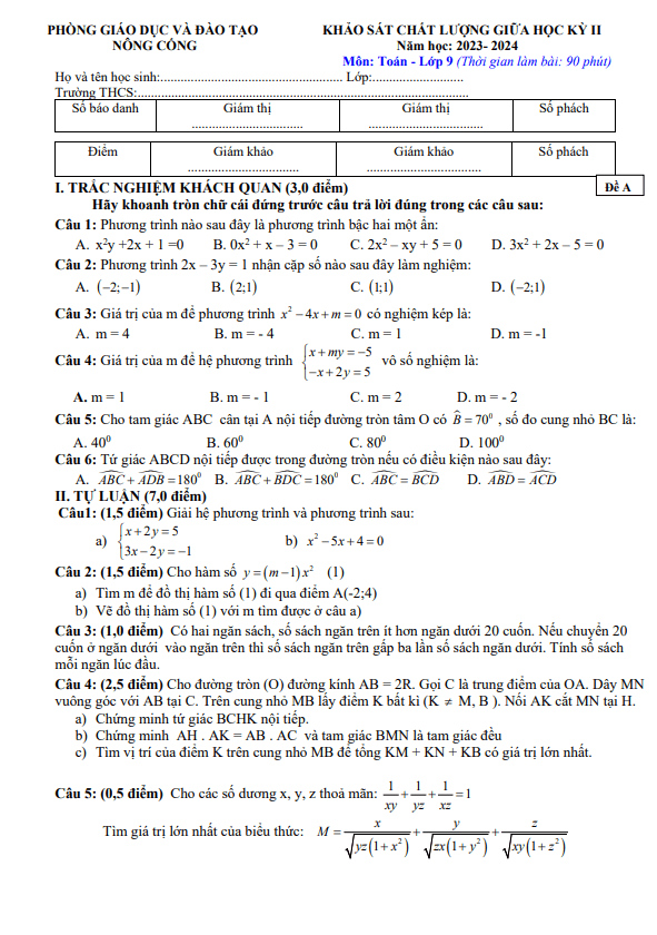 Đề Thi Giữa HK2 Toán 9 Đề giữa học kỳ 2 Toán 9 năm 2023 – 2024 phòng GD&ĐT Nông Cống – Thanh Hóa 19/03/2024