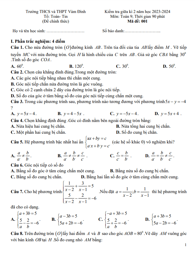 Đề Thi Giữa HK2 Toán 9 Đề giữa kì 2 Toán 9 năm 2023 – 2024 trường THCS&THPT Vàm Đình – Cà Mau 19/03/2024