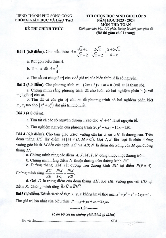 Đề Thi HSG Toán 9 Đề học sinh giỏi Toán 9 năm 2023 – 2024 phòng GD&ĐT Sông Công – Thái Nguyên 19/03/2024