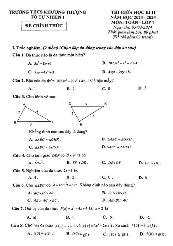 Đề giữa học kì 2 Toán 7 năm 2023 – 2024 trường THCS Khương Thượng – Hà Nội