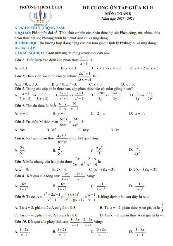 Đề Cương Ôn Tập Toán 8 Đề cương giữa kì 2 Toán 8 năm 2023 – 2024 trường THCS Lê Lợi – Hà Nội 01/03/2024