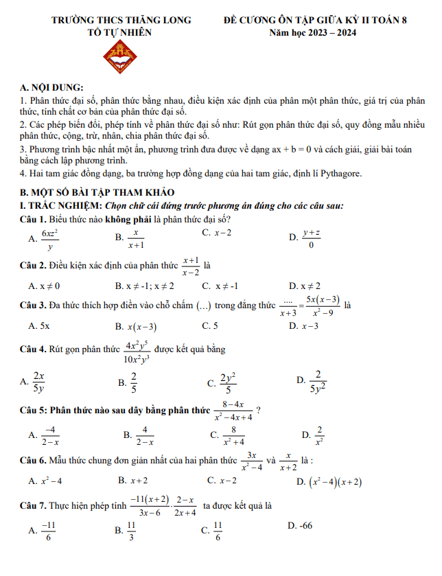 Đề Cương Ôn Tập Toán 8 Đề cương giữa kỳ 2 Toán 8 năm 2023 – 2024 trường THCS Thăng Long – Hà Nội 02/03/2024