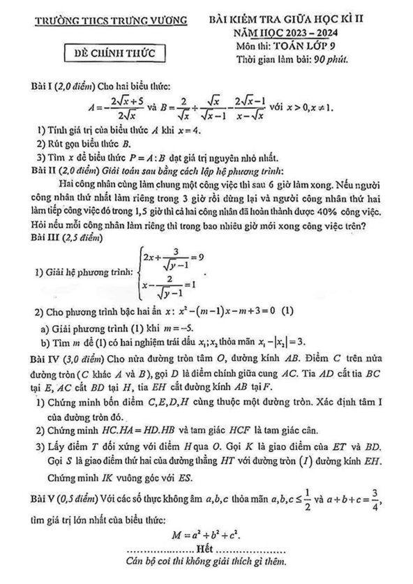 Đề Thi Giữa HK2 Toán 9 Đề giữa học kì 2 Toán 9 năm 2023 – 2024 trường THCS Trưng Vương – Hà Nội 03/03/2024