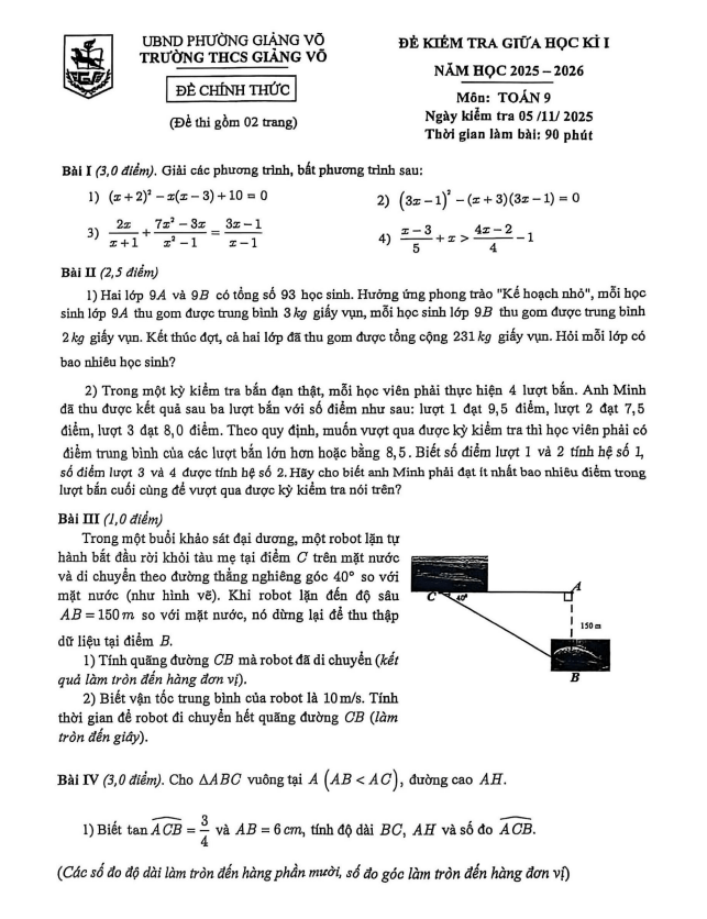 Đề giữa học kì 1 Toán 9 năm 2025 – 2026 trường THCS Giảng Võ – Hà Nội