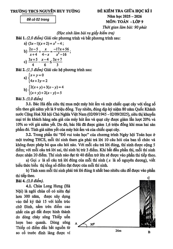 Đề giữa học kì 1 Toán 9 năm 2025 – 2026 trường THCS Nguyễn Huy Tưởng – Hà Nội