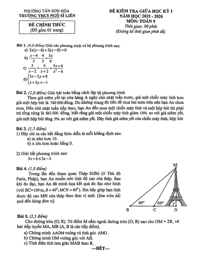 Đề giữa học kỳ 1 Toán 9 năm 2025 – 2026 trường THCS Ngô Sĩ Liên – TP HCM