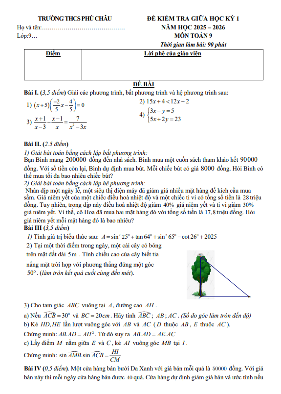 Đề giữa học kỳ 1 Toán 9 năm 2025 – 2026 trường THCS Phú Châu – Hà Nội