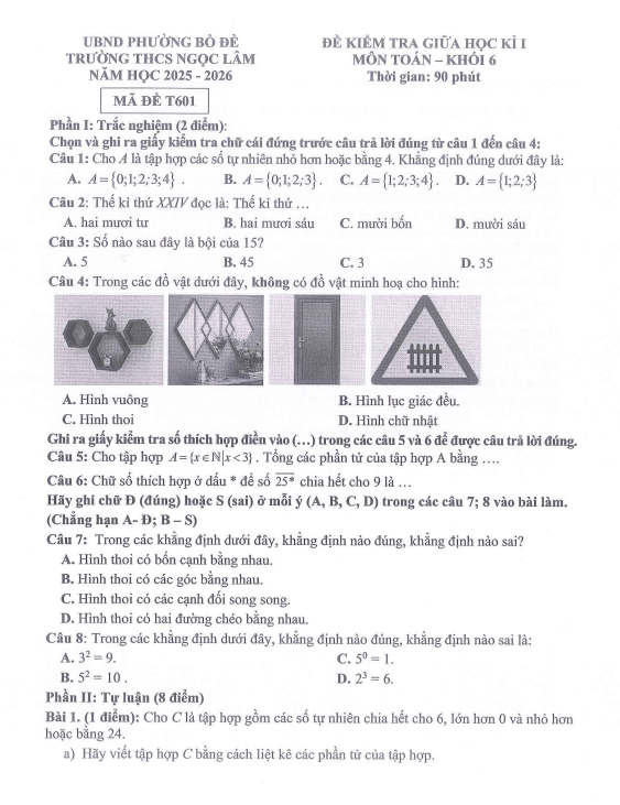 Đề giữa kì 1 Toán 6 năm 2025 – 2026 trường THCS Ngọc Lâm – Hà Nội
