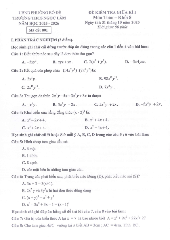 Đề giữa kì 1 Toán 8 năm 2025 – 2026 trường THCS Ngọc Lâm – Hà Nội