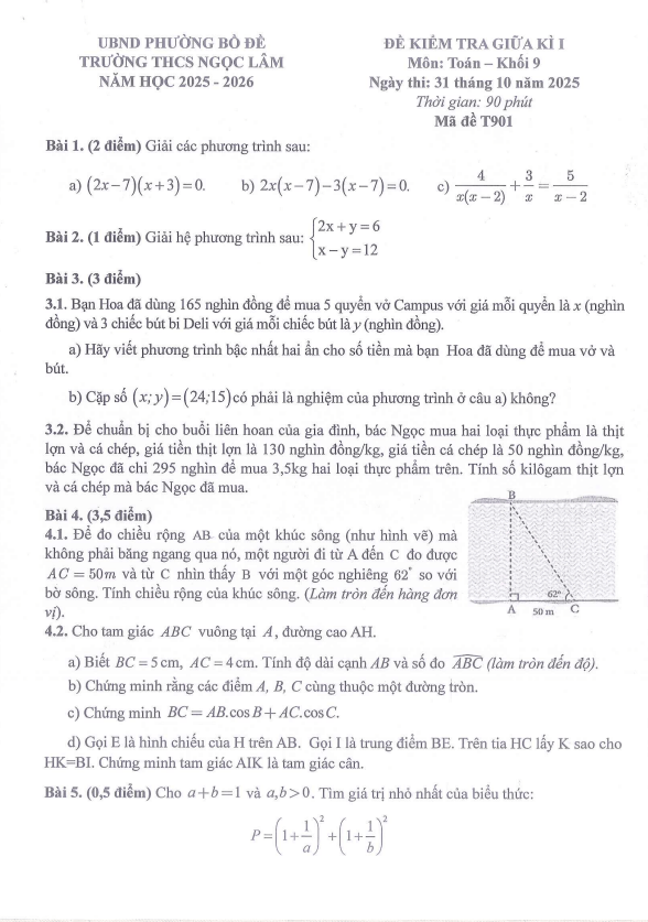 Đề giữa kì 1 Toán 9 năm 2025 – 2026 trường THCS Ngọc Lâm – Hà Nội