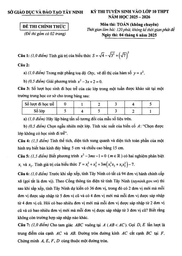 Đề tuyển sinh lớp 10 môn Toán (không chuyên) năm 2025 – 2026 sở GD&ĐT Tây Ninh