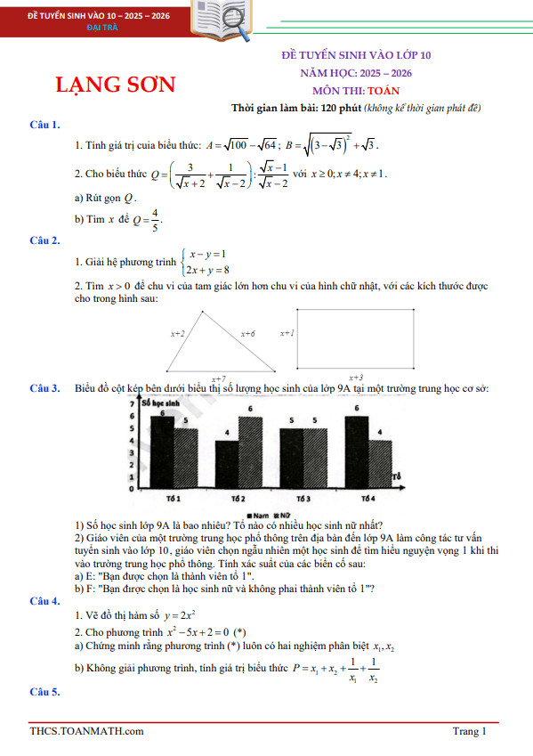 Đề tuyển sinh lớp 10 môn Toán năm 2025 – 2026 sở GD&ĐT Lạng Sơn