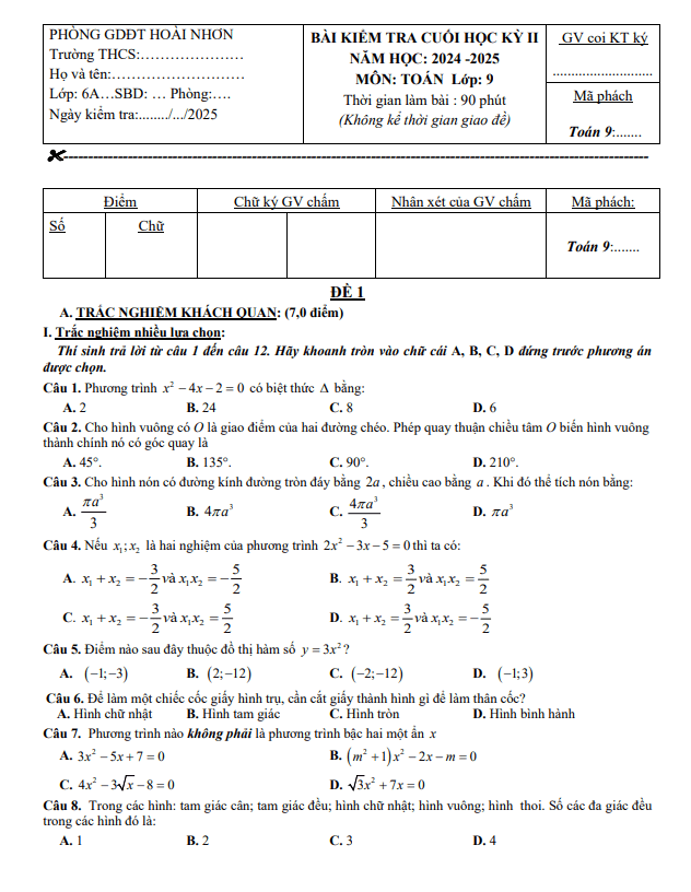 Đề Thi HK2 Toán 9 Đề cuối học kỳ 2 Toán 9 năm 2024 – 2025 phòng GD&ĐT Hoài Nhơn – Bình Định 12/05/2025