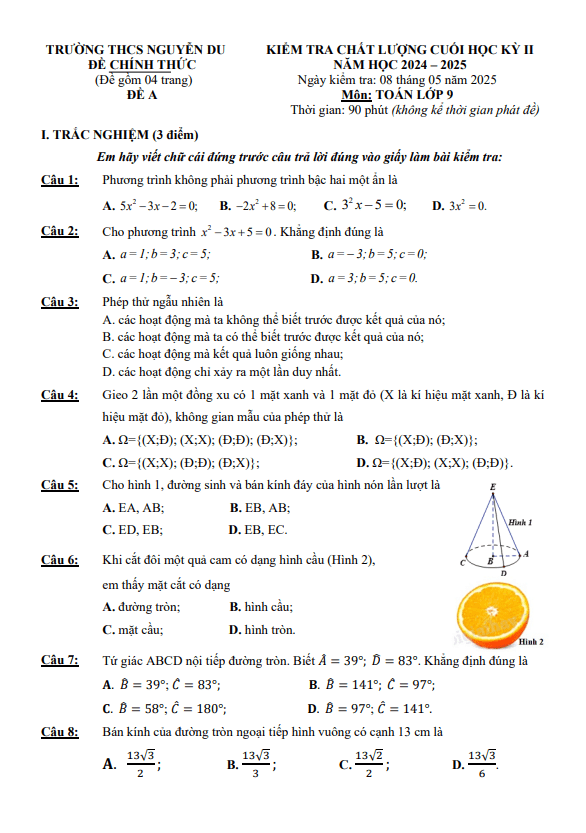 Đề Thi HK2 Toán 9 Đề cuối học kỳ 2 Toán 9 năm 2024 – 2025 trường THCS Nguyễn Du – Lâm Đồng 12/05/2025
