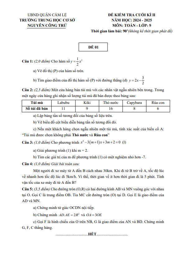 Đề Thi HK2 Toán 9 Đề cuối kì 2 Toán 9 năm 2024 – 2025 trường THCS Nguyễn Công Trứ – Đà Nẵng 11/05/2025