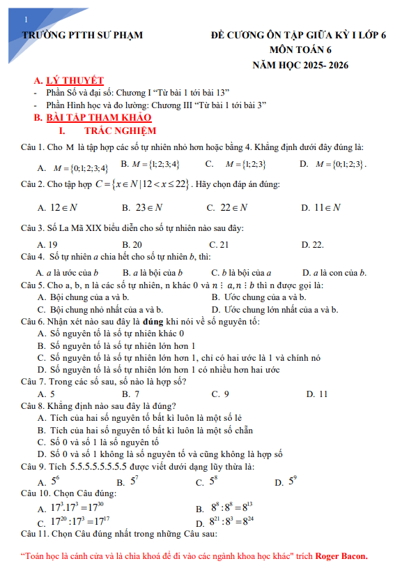 Tổng hợp ĐỀ CƯƠNG ÔN TẬP TOÁN 6 hướng dẫn nội dung ôn tập kiểm tra giữa học kì 1 / cuối học kì 1 / giữa học kì 2 / cuối học kì 2 môn Toán 6 (định dạng PDF + WORD), có đáp án và lời giải chi tiết.