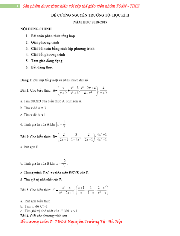 Đề cương Toán 8 HK2 năm 2018 – 2019 trường THCS Nguyễn Trường Tộ – Hà Nội