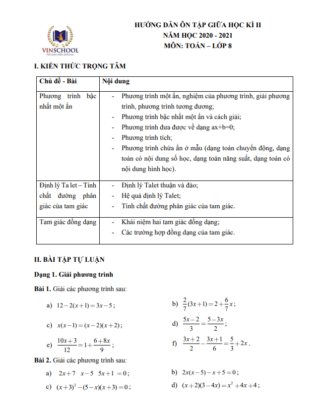 Hướng dẫn ôn tập giữa kì 2 Toán 8 năm 2020 – 2021 trường Vinschool – Hà Nội