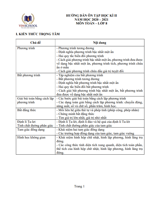 Hướng dẫn ôn tập học kì 2 Toán 8 năm 2020 – 2021 trường Vinschool – Hà Nội