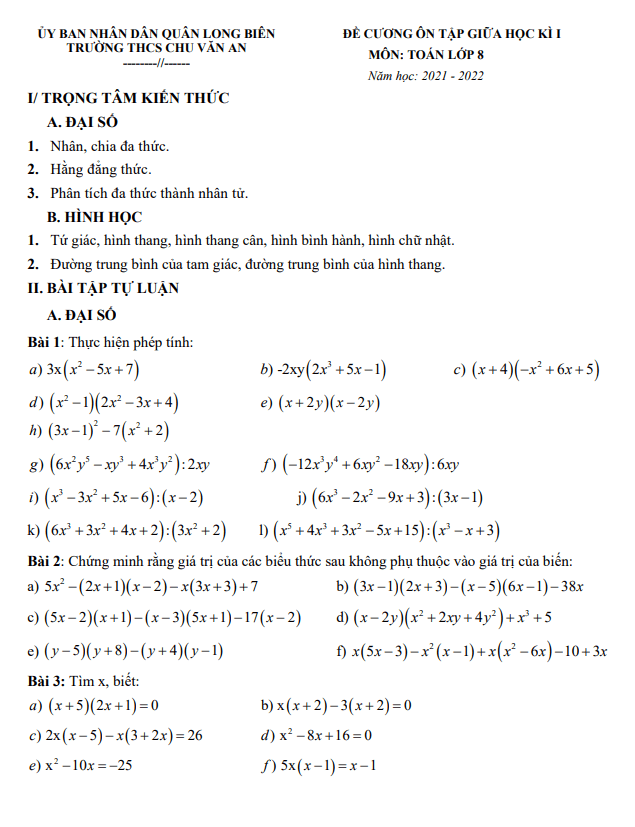 Đề cương ôn tập giữa kì 1 Toán 8 năm 2021 – 2022 trường THCS Chu Văn An – Hà Nội