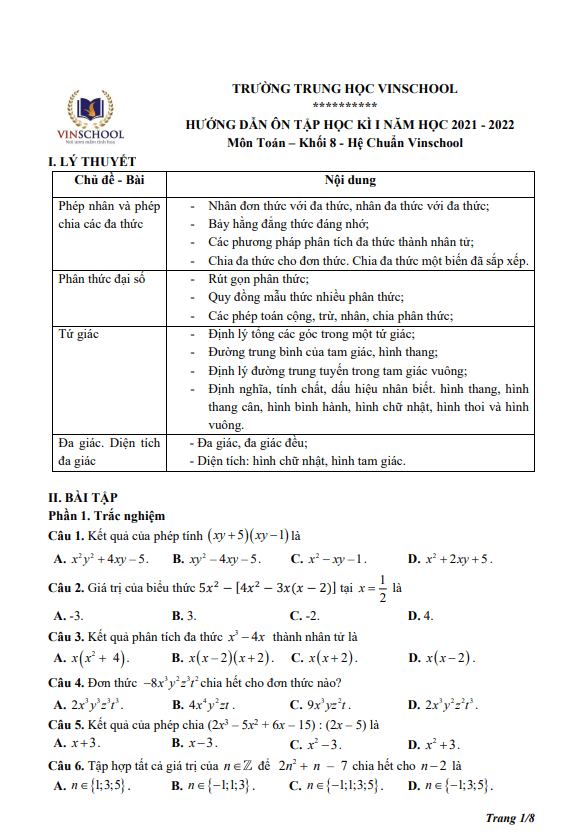 Hướng dẫn ôn tập học kì 1 Toán 8 năm 2021 – 2022 trường Vinschool – Hà Nội