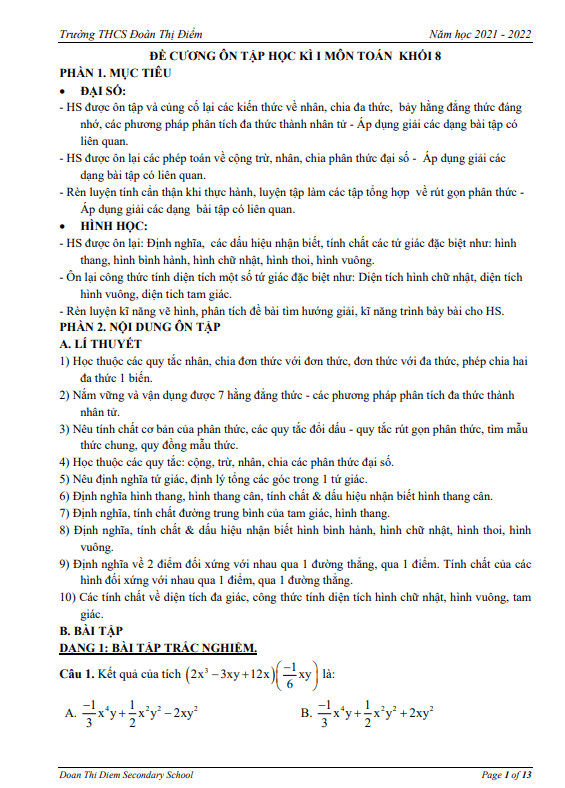 Đề cương ôn tập học kì 1 Toán 8 năm 2021 – 2022 trường THCS Đoàn Thị Điểm – Hà Nội