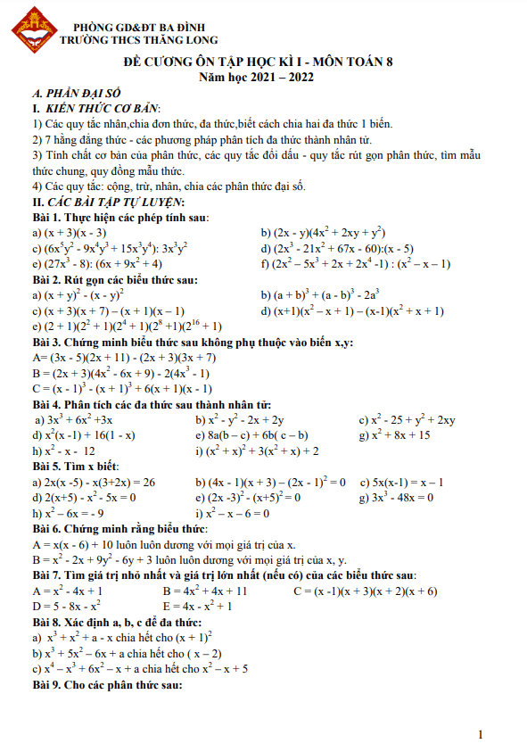 Đề cương ôn tập học kì 1 Toán 8 năm 2021 – 2022 trường THCS Thăng Long – Hà Nội
