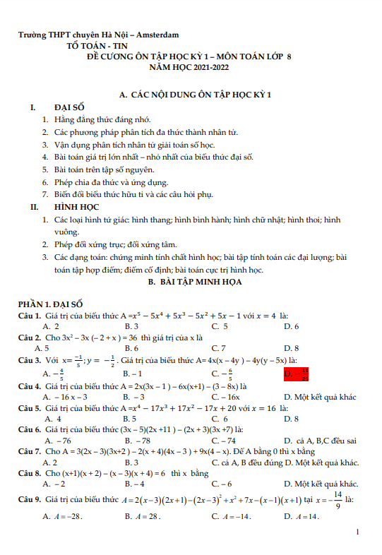 Đề cương ôn tập học kỳ 1 Toán 8 năm 2021 – 2022 trường chuyên Hà Nội – Amsterdam