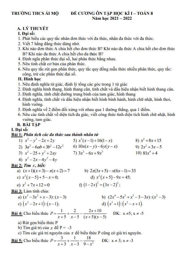 Đề cương ôn tập học kỳ 1 Toán 8 năm 2021 – 2022 trường THCS Ái Mộ – Hà Nội