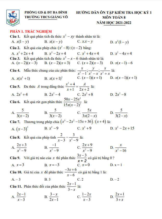 Hướng dẫn ôn tập học kỳ 1 Toán 8 năm 2021 – 2022 trường THCS Giảng Võ – Hà Nội