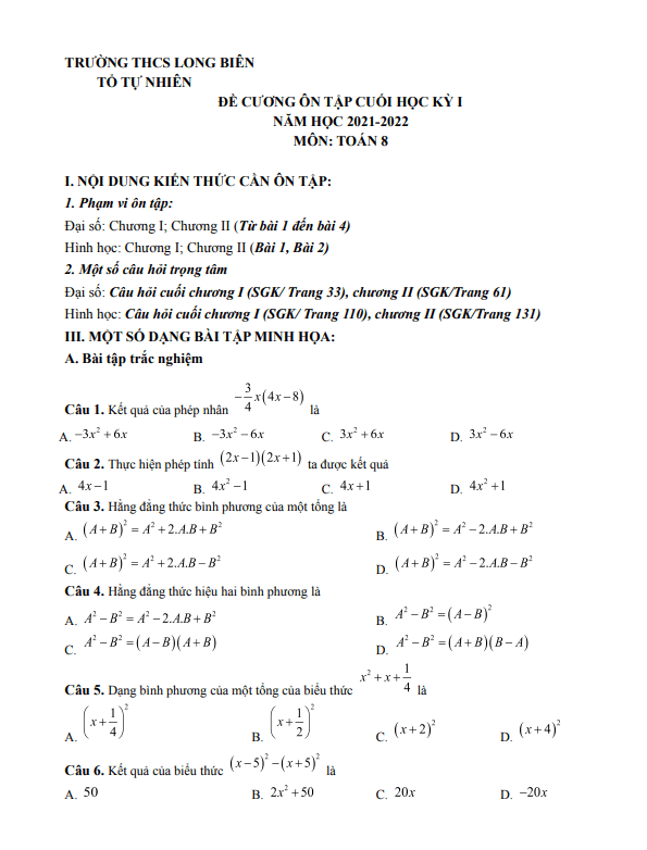 Ôn tập cuối học kỳ 1 Toán 8 năm 2021 – 2022 trường THCS Long Biên – Hà Nội
