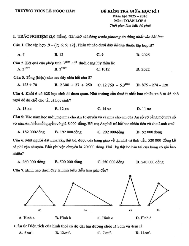 Đề giữa học kì 1 Toán 6 năm 2025 – 2026 trường THCS Lê Ngọc Hân – Hà Nội