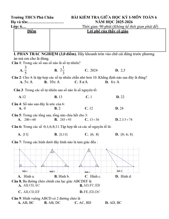 Đề giữa học kỳ 1 Toán 6 năm 2025 – 2026 trường THCS Phú Châu – Hà Nội