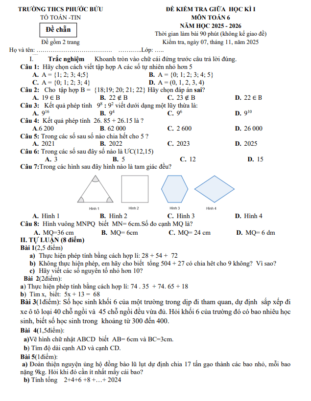 Đề giữa học kỳ 1 Toán 6 năm 2025 – 2026 trường THCS Phước Bửu – TP HCM