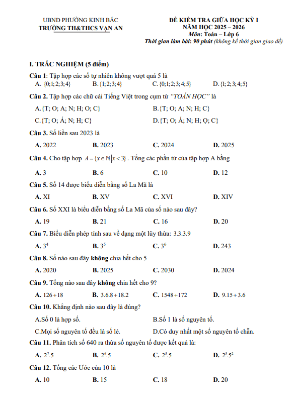 Đề giữa học kỳ 1 Toán 6 năm 2025 – 2026 trường TH&THCS Vạn An – Bắc Ninh