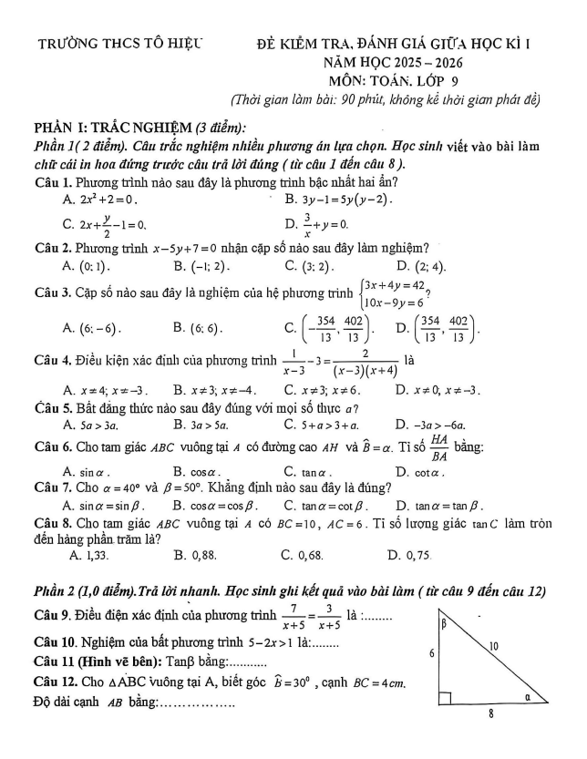 Đề giữa học kì 1 Toán 9 năm 2025 – 2026 trường THCS Tô Hiệu – Phú Thọ