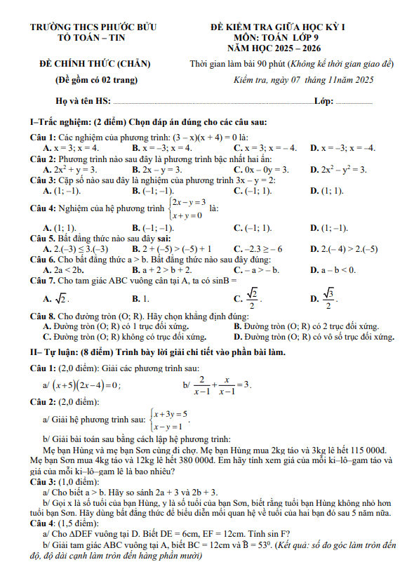Đề giữa học kỳ 1 Toán 9 năm 2025 – 2026 trường THCS Phước Bửu – TP HCM