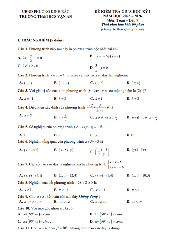 Đề giữa học kỳ 1 Toán 9 năm 2025 – 2026 trường TH&THCS Vạn An – Bắc Ninh