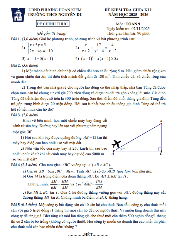 Đề giữa kì 1 Toán 9 năm 2025 – 2026 trường THCS Nguyễn Du – Hà Nội