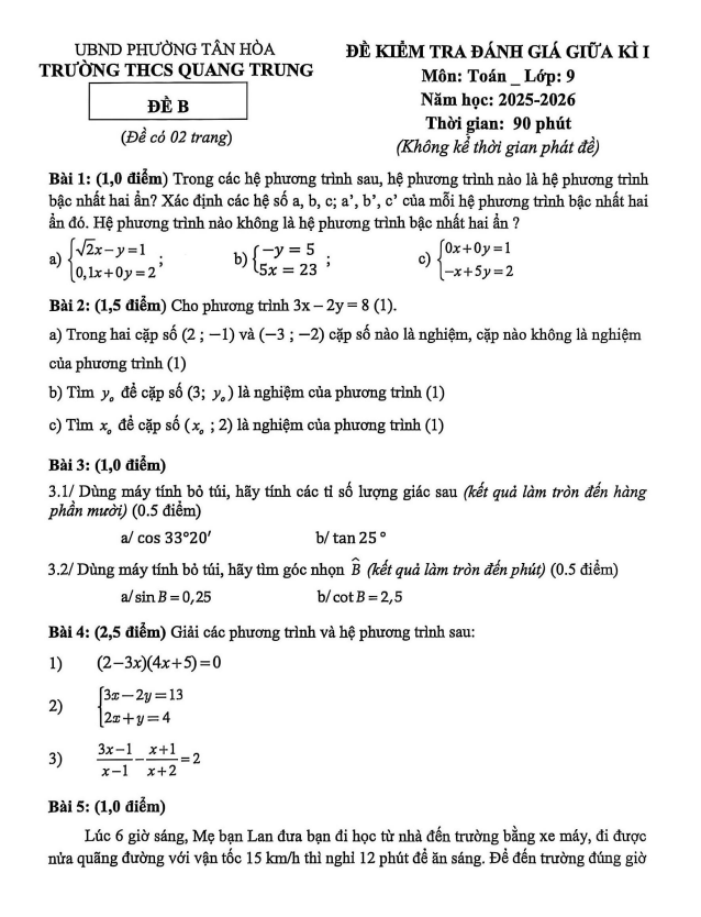 Đề giữa kì 1 Toán 9 năm 2025 – 2026 trường THCS Quang Trung – TP HCM