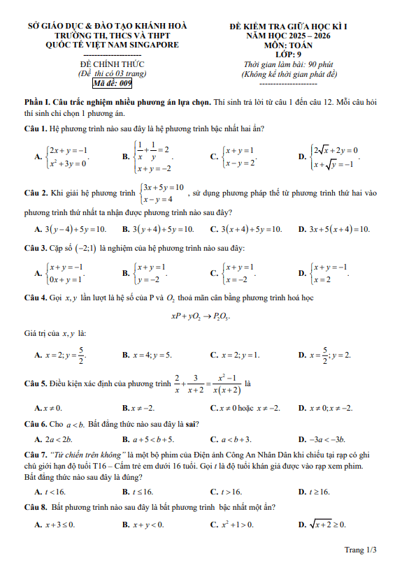 Đề GK1 Toán 9 năm 2025 – 2026 trường Quốc tế Việt Nam Singapore – Khánh Hòa