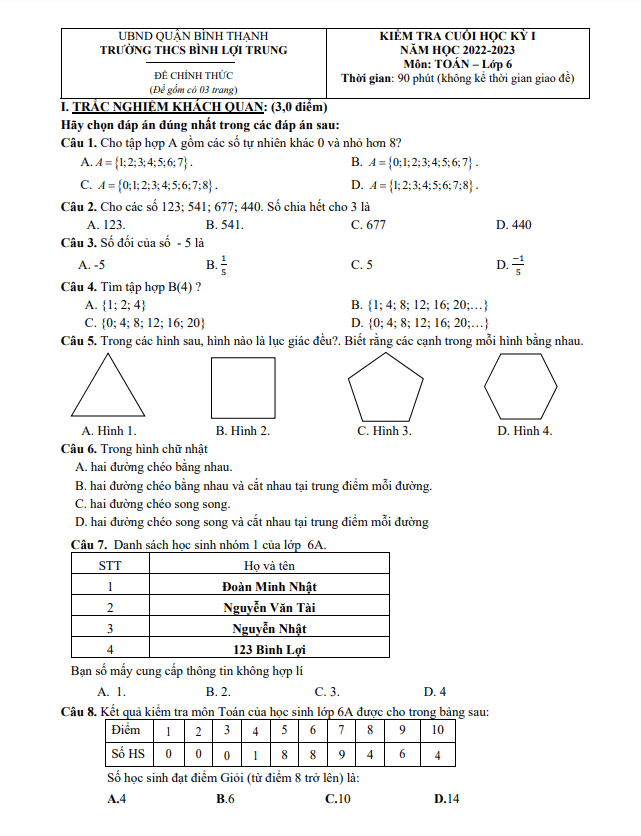 Đề tham khảo cuối kỳ 1 Toán 6 năm 2022 – 2023 trường THCS Bình Lợi Trung – TP HCM