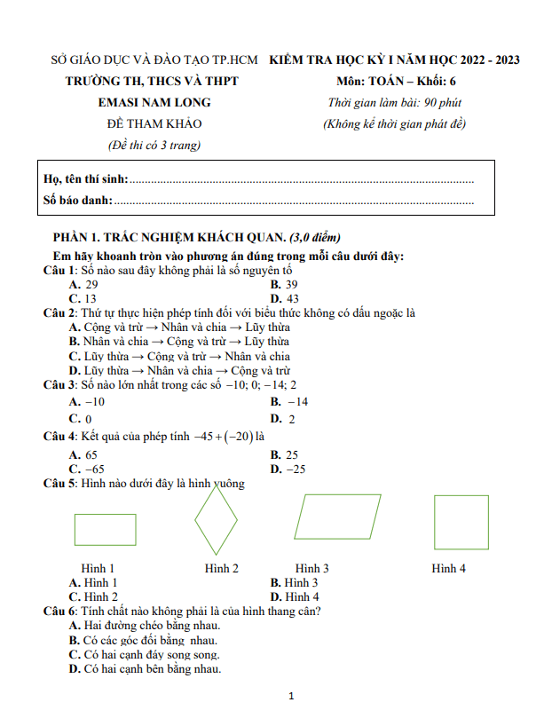 Đề tham khảo học kỳ 1 Toán 6 năm 2022 – 2023 trường EMASI Nam Long – TP HCM