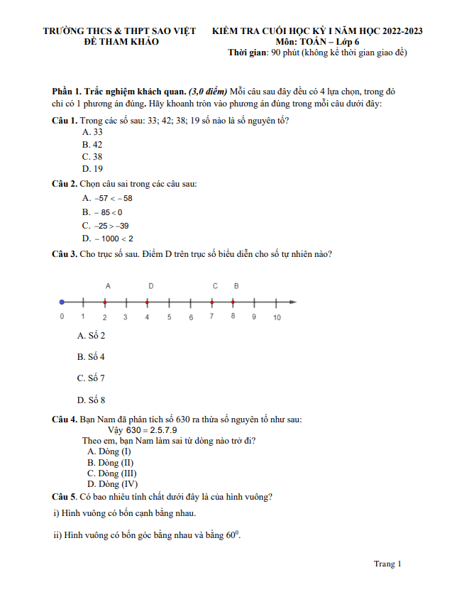 Đề tham khảo học kỳ 1 Toán 6 năm 2022 – 2023 trường Sao Việt – TP HCM
