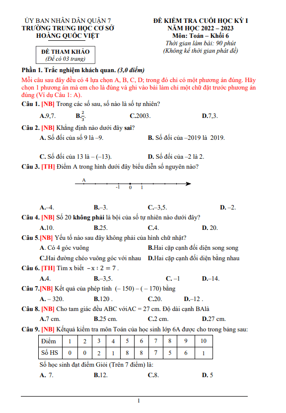 Đề tham khảo học kỳ 1 Toán 6 năm 2022 – 2023 trường THCS Hoàng Quốc Việt – TP HCM